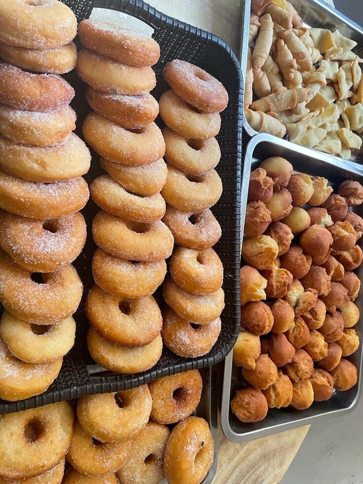 Desserts have freshly 50 donuts with tray of heavy cream on side. And a tray of freshly made strawberries on the side. And a tray of fresh starwberries soaked in sweet syrup separated for you to pick and place on top of heavy cream when placed on top of donut.